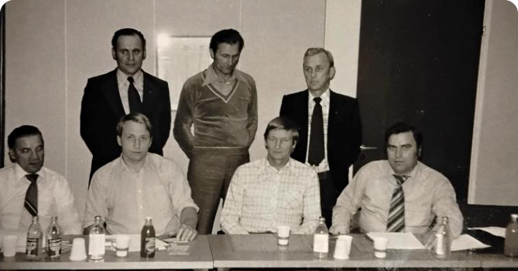 Tapio Mäkinen, yksi SKAL: n yksi pidetyimmistä puheenjohtajista, aloitti järjestöuransa sopimusliikenteen jaoston hallituksessa v. 1978. Kuvassa jaoston työryhmä: vasemmalta istumassa