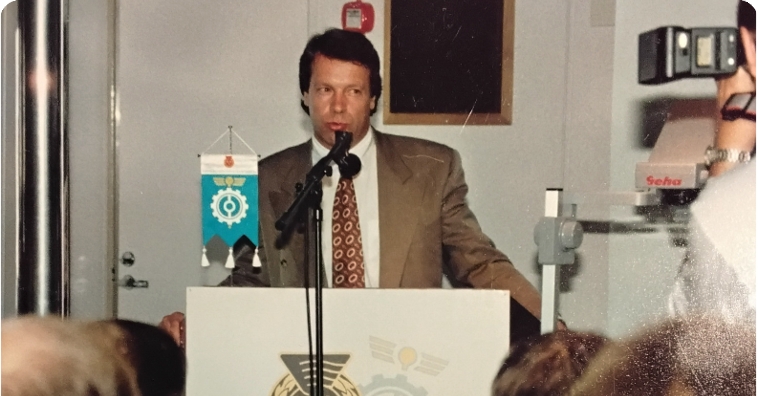 Turkulainen Ilkka Kanerva oli suosittu poliitikko kuljetusalalla. Tässä hän on liikenneministerin ominaisuudessa avaamassa sopimusliikenteen jaoston laivaseminaaria Turussa elokuussa 1989.